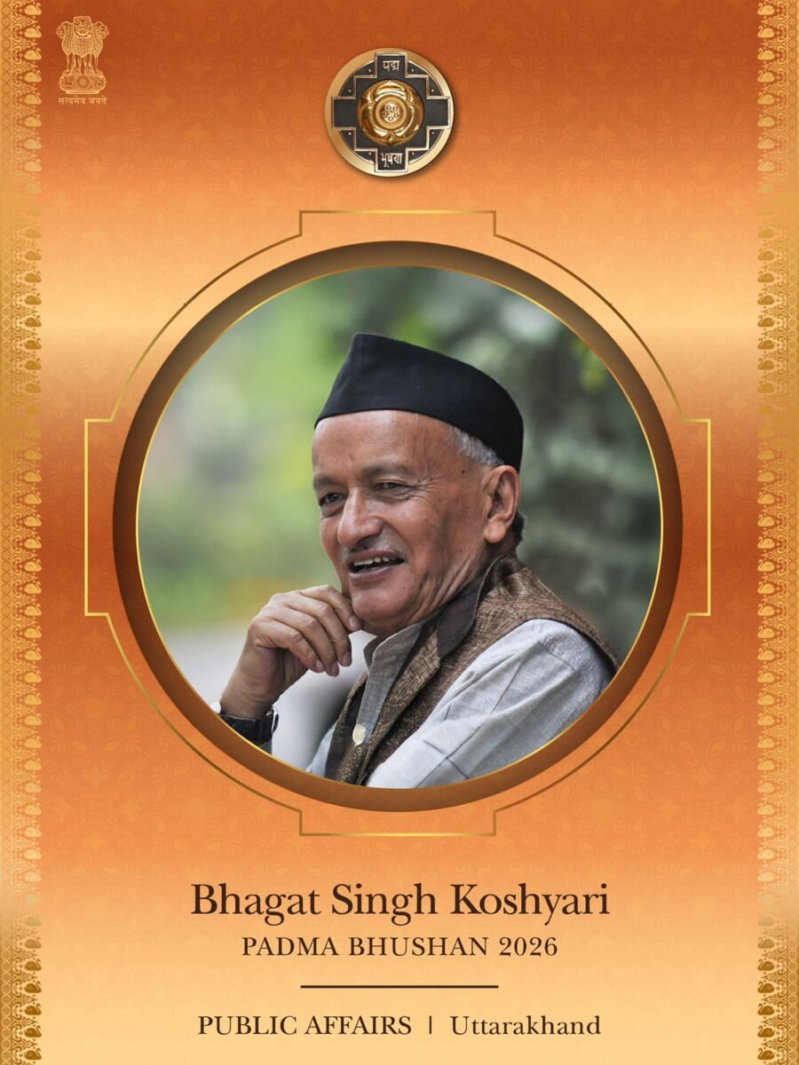- उत्तराखंड के पूर्व सीएम भगत सिंह कोश्यारी को पद्मभूषण सम्मान से सम्मानित किया जाएगा