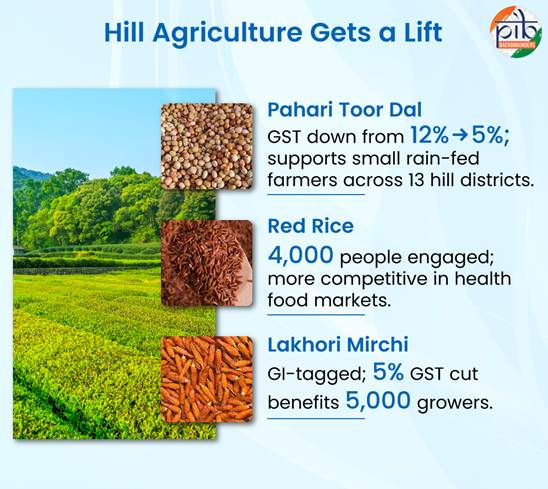 • पहाड़ी तूर दाल, लाल चावल और लखौरी मिर्च पर जीएसटी घटाकर 5% करने से पहाड़ी उत्पादों को बढ़ावा मिला है, जिससे 13 पहाड़ी जिलों के छोटे किसानों को मदद मिली है।