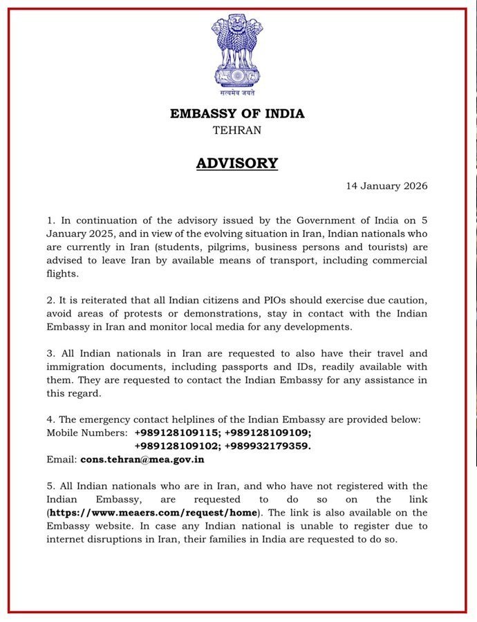 एडवायजरी में नागरिकों से सतर्क रहने, अशांत इलाकों से दूर रहने और ईरान में भारतीय दूतावास के संपर्क में बने रहने की भी अपील की गई है। देश में हाल ही में विरोध प्रदर्शनों में 2,500 से अधिक लोगों की मौत की खबरें सामने आई हैं, जिससे सुरक्षा स्थिति और जटिल हो गई है।