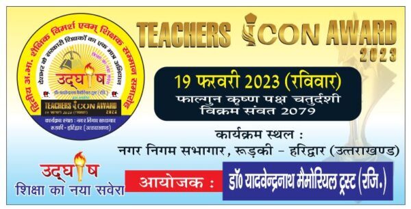 रूडकी । उद्घोष : शिक्षा का नया सवेरा के तत्वाधान में द्वितीय अ.भा.शैक्षिक विमर्श एवं शिक्षक सम्मान समारोह आगामी उन्नीस फरवरी को नगर निगम सभागार रूडकी में मनाया जायेगा । राष्ट्रीय शिक्षा निति-2020 नवाचार एवं संभावनाएं विषय पर आयोजित समारोह में टीचर्स आईकन एवार्ड से भी देश भर के विभिन्न राज्यों के लगभग सवा सौ शिक्षकों को सम्मानित किया जायेगा । कार्यक्रम संयोजक संजय वत्स तथा सह संयोजक मु.इकराम ने बताया कि इस अवसर पर मुख्य अतिथि के रुप में मेयर गौरव गोयल व विशिष्ट अतिथि के रूप में राज्य संसाधन केन्द्र उत्तराखण्ड की पूर्व निदेशक डॉ.प्रिया जाडू, एससीईआरटी के सहयक निदेशक कृष्णानंद बिल्जवाण हस्तिनापुर, यूपी के खंड शिक्षाधिकारी राहुल धामा, मैराज अहमद, खंड शिक्षाधिकारी नारसन, ग्लोकल विश्वविद्यालय, सहारनपुर के प्रतिकुलपति प्रो.डॉ.पंकज मिश्रा आदि शिक्षाविद जुटेंगे ।