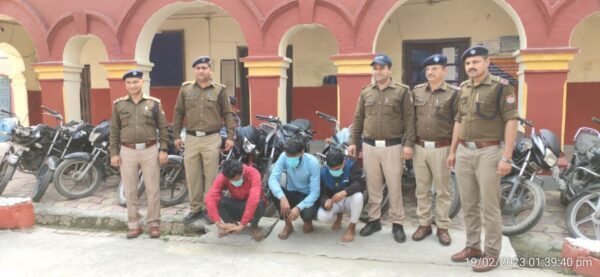 लक्सर/हरिद्वार : मोटरसाईकिल चोरी की घटनाओं की रोकथाम एवं चोरी हुए वाहनों की बरामदगी हेतु एसएसपी अजय सिंह द्वारा दिए गए निर्देश के क्रम में गठित पुलिस टीम ने बड़ा खुलासा करते हुए बाइक चोरी गैंग के 03 महत्वपूर्ण सदस्यों को दबोचने में सफलता हासिल की। विभिन्न CCTV फुटेज एवं अन्य सबूत जुटा रही टीम ने मुखबिर की सूचना पर 19 फरवरी 2023 को बेगम पुल के पास दौराने चैकिंग पल्सर व प्लेटिना मोटर साईकिल पर सवार 05 संदिग्ध व्यक्तियों को रोका। भागने का प्रयास कर रहे पांचो  व्यक्ति में से पुलिस टीम ने 03 व्यक्तियों को मोटर साइकिलो सहित पकड लिया जबकि दो व्यक्ति गन्ने के खेत का फायदा उठाकर भागने में सफल रहे। उक्त गिरोह पकडे गये व्यक्तियों से मौके पर 03 तथा पूछताछ एवं निशांदेही के आधार पर  12 मोटर साईकिल बरामद की गयी जिनके सम्बन्ध में कोतवाली लक्सर में 07 , थाना कलियर में 02 व थाना पथरी में 01