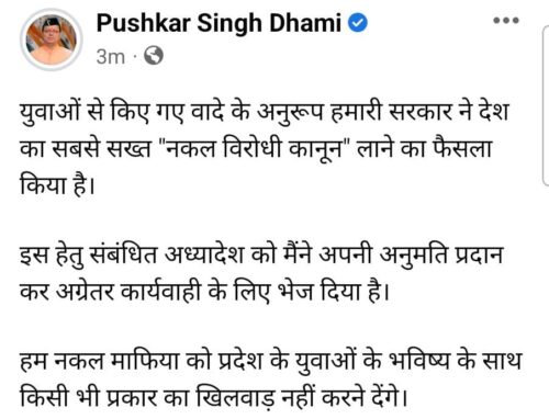 सीएम पुष्कर सिंह धामी का बड़ा फैसला, उत्तराखंड नकल विरोधी कानून के अध्यादेश को मंजूरी, आजीवन कारावास तक की सजा सहित किये गये यह सख्त प्रावधान………
