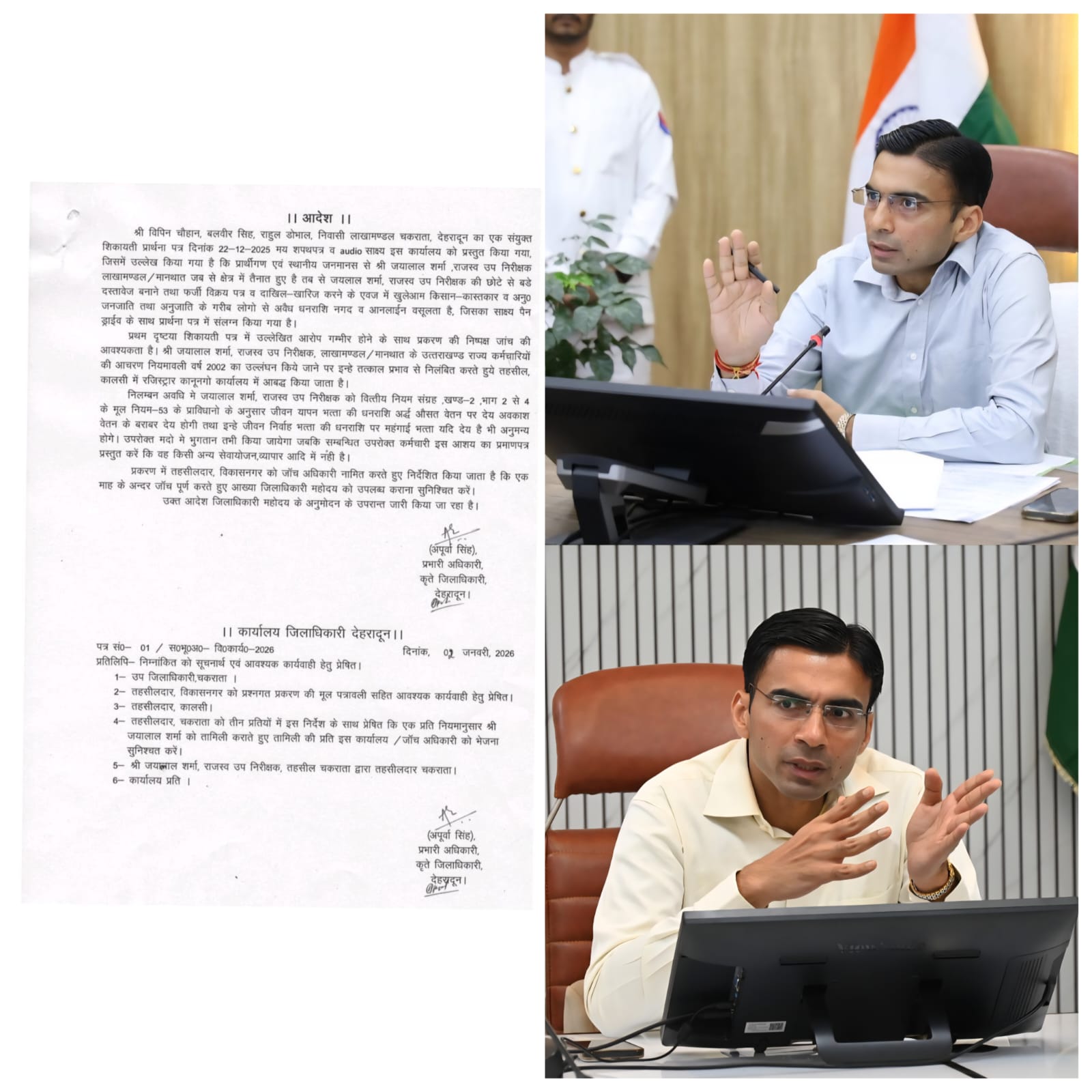देहरादून, लाखामण्डल क्षेत्र में अवैध वसूली की शिकायत पर जिलाधिकारी सविन बंसल ने कड़ी कार्रवाई करते हुए राजस्व उप निरीक्षक (पटवारी) जयलाल शर्मा को तत्काल प्रभाव से निलंबित कर दिया गया है। निलंबन अवधि में उन्हें तहसील कालसी स्थित रजिस्ट्रार कानूनगो कार्यालय में संबद्ध किया गया है।