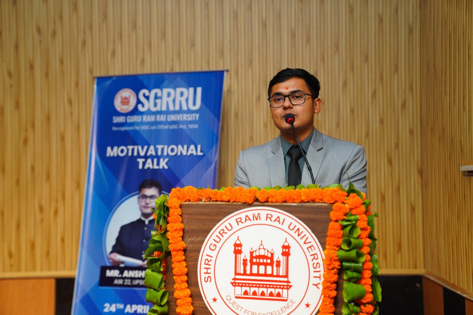 गुरुवार को श्री गुरु राम राय विश्वविद्यालय के पटेल नगर ऑडिटोरियम में प्रेरक वार्ता का आयोजन किया गया। एसजीआरआर विश्वविद्यालय की कुलपति (प्रो.) डाॅ कुमुद सकलानी ने मुख्य वक्ता के रूप में पधारे अंशुल भट्ट का स्वागत किया। उन्होंने कहा कि हर माता पिता का यह सपना होता है कि उनका बेटा आई.ए.एस. बने। अंशुल भट्ट की सफलता यह बताती है कि उनके अथक प्रयासों ने उन्हें यह मुकाम हासिल करने में महत्वपूर्ण भूमिका निभाई। अंशुल भट्ट के जैसे होनहार छात्र आज के युवाओं के लिए रोल माॅडल हैं।  काबिलेगौर है कि अंशुल भट्ट की यह यात्रा प्रेरणादायक रही है। वे अब तक पौड़ी, हरिद्वार, रुड़की, अल्मोड़ा, हल्द्वानी, काशीपुर और रुद्रपुर जैसे विभिन्न शहरों के 10 अलग-अलग स्कूलों में पढ़ चुके हैं। 12वीं कक्षा में उन्होंने 99 प्रतिशत अंक प्राप्त किए थे। स्नातक उन्होंने दिल्ली विश्वविद्यालय के सेंट स्टीफेंस कॉलेज से किया, जहाँ वे कई छात्र प्रतिनिधित्व पदों पर रहे।