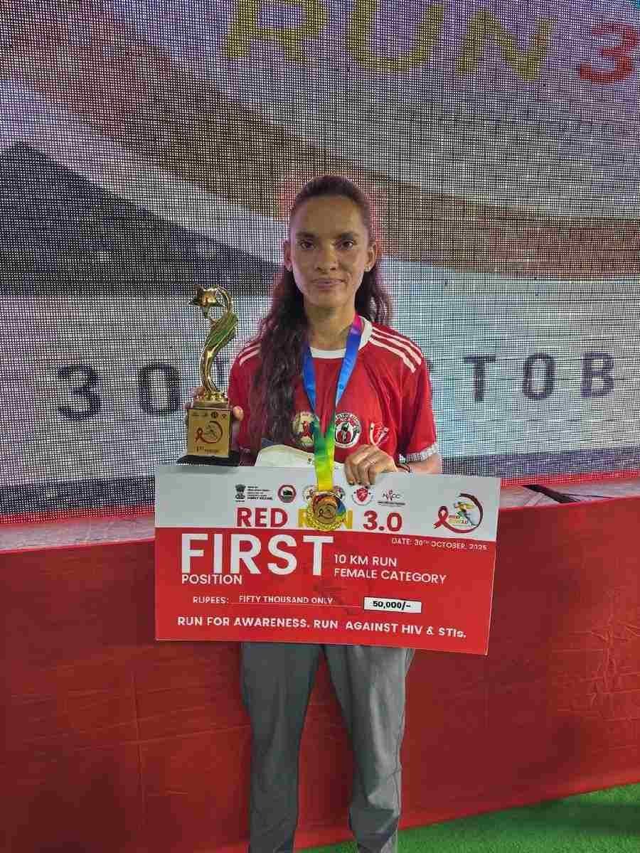देहरादून : 30 अक्टूबर 2025 का दिन उत्तराखण्ड के लिए गर्व का क्षण बन गया, जब चमोली जनपद के छोटे से गांव लुन्तरा (पो. नंदानगर) की बेटी कुमारी अनीशा ने राष्ट्रीय स्तर पर आयोजित रेड रन मैराथन 3.0 में देशभर के प्रतिभाशाली धावकों को पछाड़ते हुए महिला वर्ग में प्रथम स्थान हासिल किया। अनीशा ने 10 किलोमीटर की 3.0 प्रतियोगिता की दौड़ में प्रथम स्थान प्राप्त किया। यह प्रतियोगिता स्वास्थ्य एवं परिवार कल्याण मंत्रालय, भारत सरकार के राष्ट्रीय एड्स नियंत्रण संगठन (नाको) द्वारा नागालैण्ड के दीमापुर जनपद में आयोजित की गई थी। सचिव, चिकित्सा स्वास्थ्य एवं चिकित्सा शिक्षा/परियोजना निदेशक डॉ. आर. राजेश कुमार ने कुमारी अनीशा को राष्ट्रीय स्तर पर प्रथम स्थान प्राप्त करने पर हार्दिक बधाई देते हुए कहा कि उनकी यह सफलता पूरे उत्तराखण्ड के लिए गर्व का विषय है। उन्होंने अनीशा के उज्ज्वल भविष्य की कामना की।