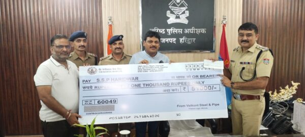 आज 04 सितम्बर 2023 को उक्त सफल खुलासे पर वादी नवीन गोयल उनके साथ आए सचिन गुप्ता एवं व्यापार मण्डल रुड़की के अन्य पदाधिकारियों द्वारा खुशी जाहिर करते हुए एसएसपी अजय सिंह से उनके रोशनाबाद स्थित कार्यालय में मुलाकात कर कोतवाली गंगनहर पुलिस के टीम वर्क की प्रशंसा एवं कप्तान साहब के कुशल नेतृत्व की सराहना करते हुए उनको खुलासे वाली पुलिस टीम के उत्साहवर्धन हेतु 51 हजार रुपये का चैक सौंपा।